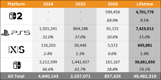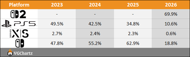 Here we see data representing the sales through to consumers and change in sales performance of the four platforms still on the market (Nintendo Switch 2, PlayStation 5, Xbox Series X|S, and Nintendo Switch 1) over comparable periods for 2023, 2024, 2025, and 2026. Also shown is the market share for each of the consoles over the same periods.