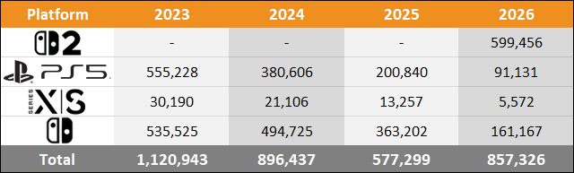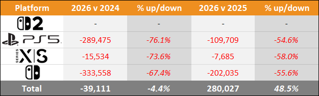 Note: VGChartz 2026, 2025, and 2023 estimates through February includes 8 weeks, while 2024 estimates includes 9 weeks.