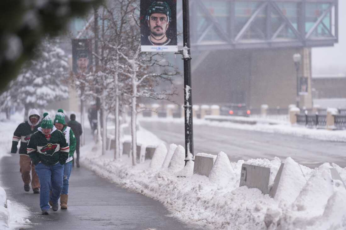 Fans walk through snowy streets before an NHL hockey game between the Minnesota Wild and Toronto Maple Leafs, Sunday, March 15, 2026, in St. Paul.